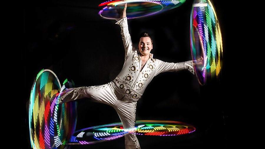 Craig can perform skilled multi-hula-hoop acts to a number of different themes.